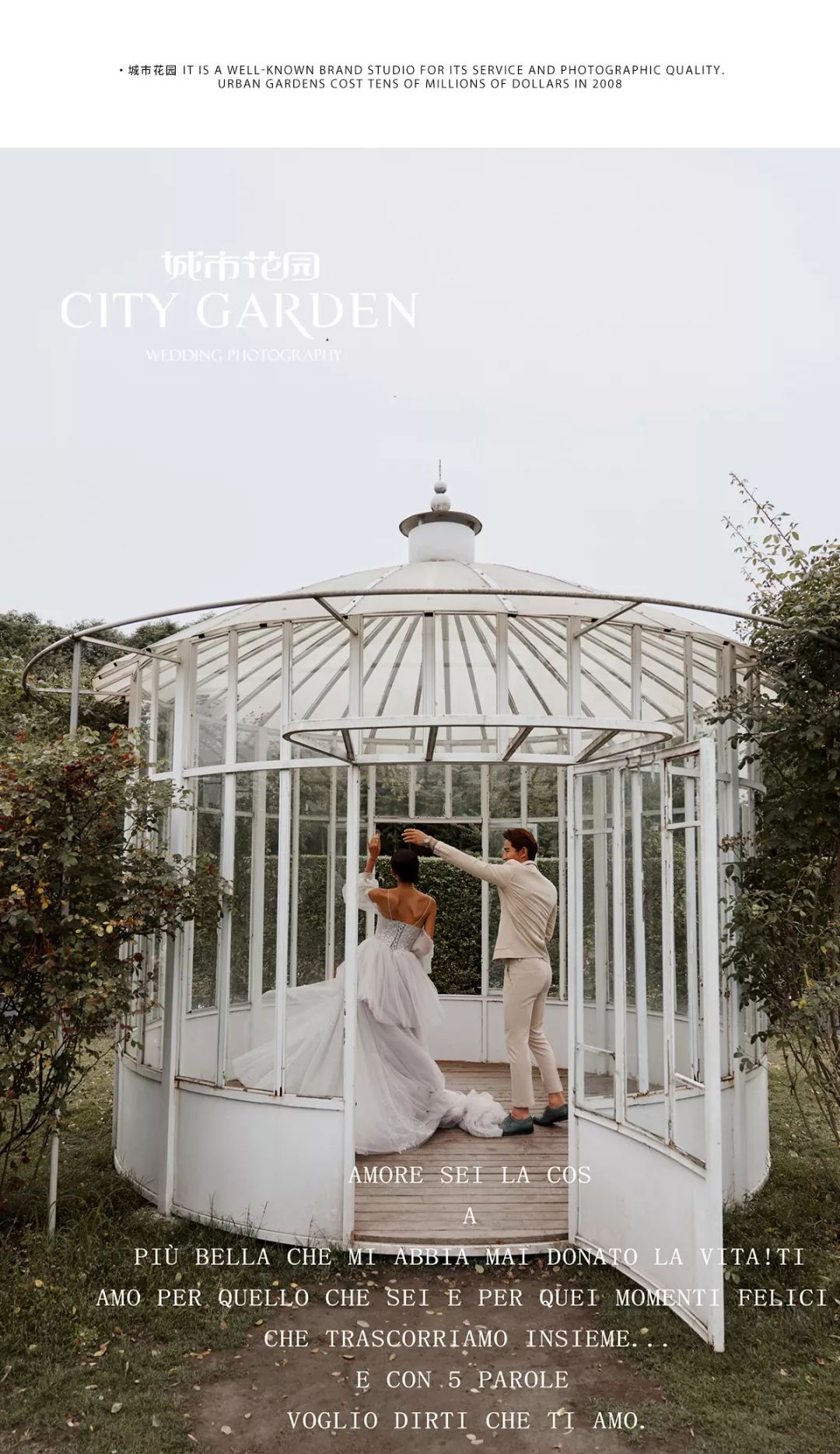 • 城市花园提醒您:决定您的婚纱照前,一定要亲临婚照拍摄现场!看到您能拍的场景环境、摸到您能穿的礼服数量,再决定才不会后悔。 • 根据统计有95%的结婚新人,亲临「城市花园•婚纱影城」免费体验婚纱照拍摄过程,之后都选择了城市花园!